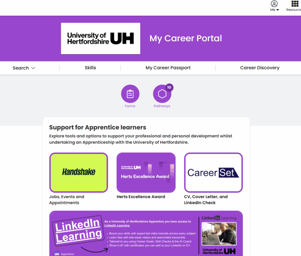 Learners also have access to a dedicated set of resources, designed specifically for them on careers.herts.ac.uk. They log in using their University login.